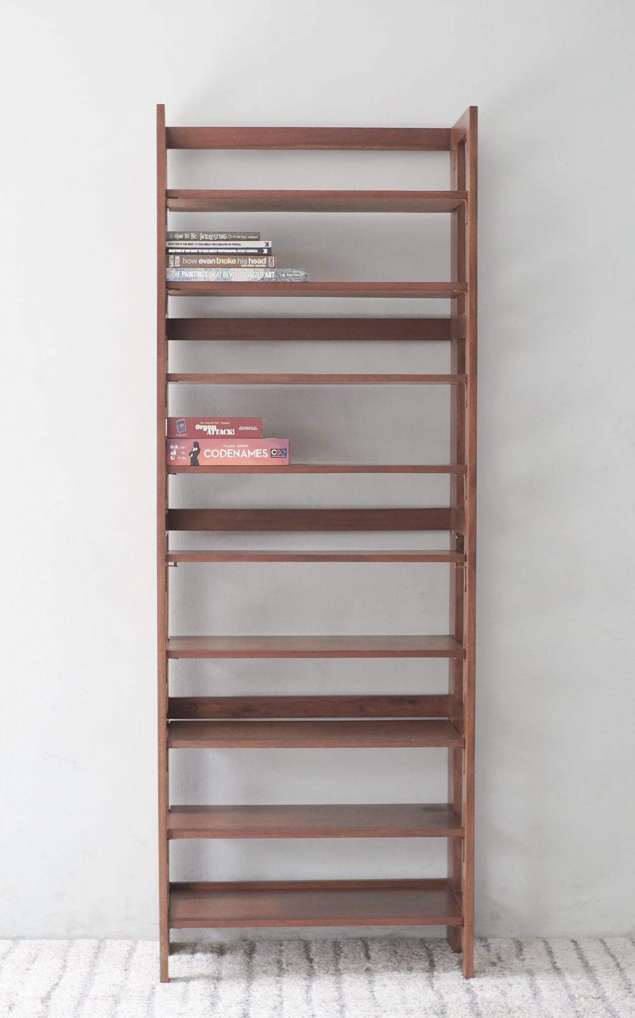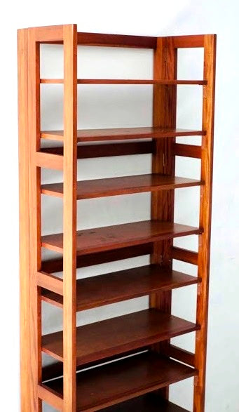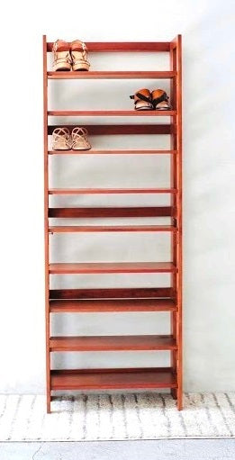 Multi-tiered shoe rack featuring 9 shelves for storage. Ample space for shoes though can also be used for general shelving. Foldable for easy storage.
